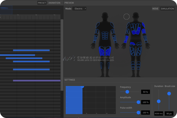 开环系统已经作为触觉编辑器工具在teslasuit上层软件中开发和实现(见图3)。触觉编辑器允许在任何ems通道内快速改变不同的电参数,或者在所有80个ems通道之间组合刺激模式以创建更复杂的刺激模式。所有这些模式都可以保存为文件,方便以后使用。
